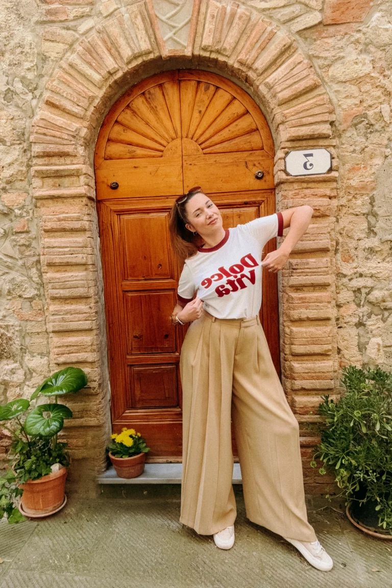 Widzisz moją koszulkę „Dolce Vita”? To nie przypadek. Ten styl to trochę ja: z jednej strony wyluzowana i przekorna, z drugiej zakochana w pięknie. Właśnie taki klimat wnoszę na sesje, bez sztuczności, z dużą uważnością i zaufaniem do tego, co prawdziwe.